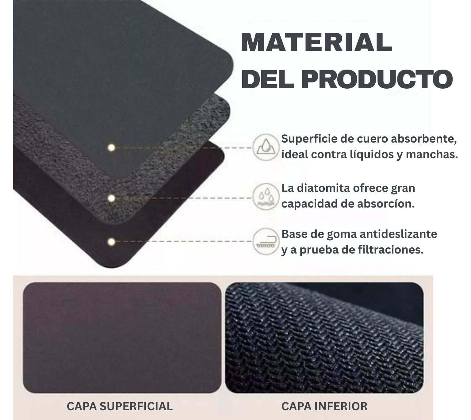 Superficie de cuero absorbente que repele líquidos y manchas, con núcleo de diatomita de alta absorción. Fabricado con fibras resistentes, fáciles de lavar y diseñadas para durar. Su base de goma antideslizante evita filtraciones, brindando seguridad, estabilidad y protección en cada uso.